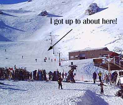 Comparing NZ skiing to my vague memories of European skiing, the main difference was actually getting to the ski fields. In France you can catch a cable car from the town centre, all the way to the top of the mountain. There's no such wussiness in NZ however, in typical no-nonsense ( / supid?) Kiwi style you drive up the mountain to the pistes. Snow chains were definitely required, as we drove up the rather preciptous road to 1600 metres! (That's 200m higher than Ben Nevis for non-mountain geeks). Seeing a packed car park, near the top of a 2000m mountain is a truly odd sight. Greg "Snake" Chalmers informed me today though, that the Mount Hutt road is about the best ski road around, and that if you found that worrying you're a big, girly, wuss (So i didn't mention to him that we caught the bus up to the top) :os